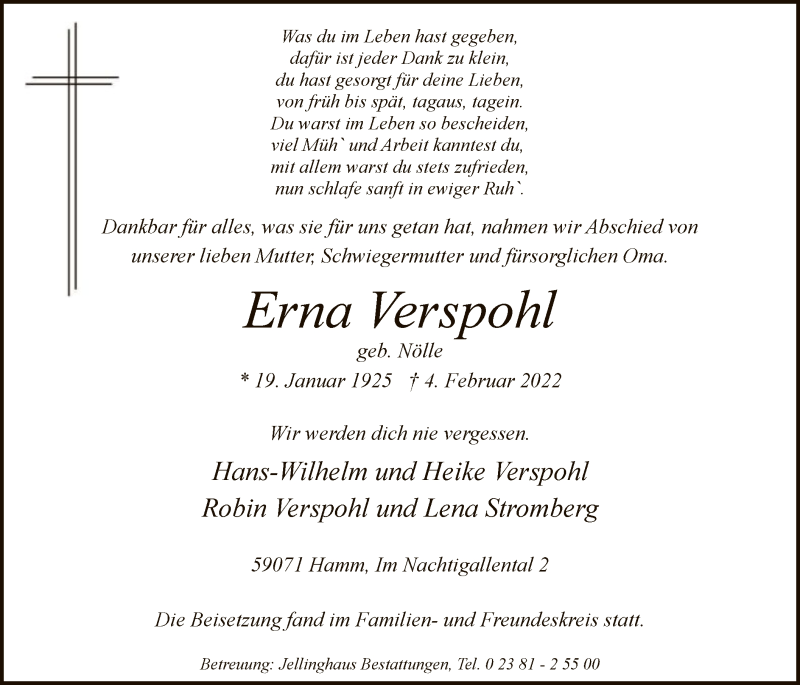 Hier finden Sie alle Traueranzeigen aus der Zeitung, die bisher für Erna Verspohl erschienen sind. Weitere Traueranzeigen, die in der Zeitung erscheinen, werden hier ebenfalls aufgelistet