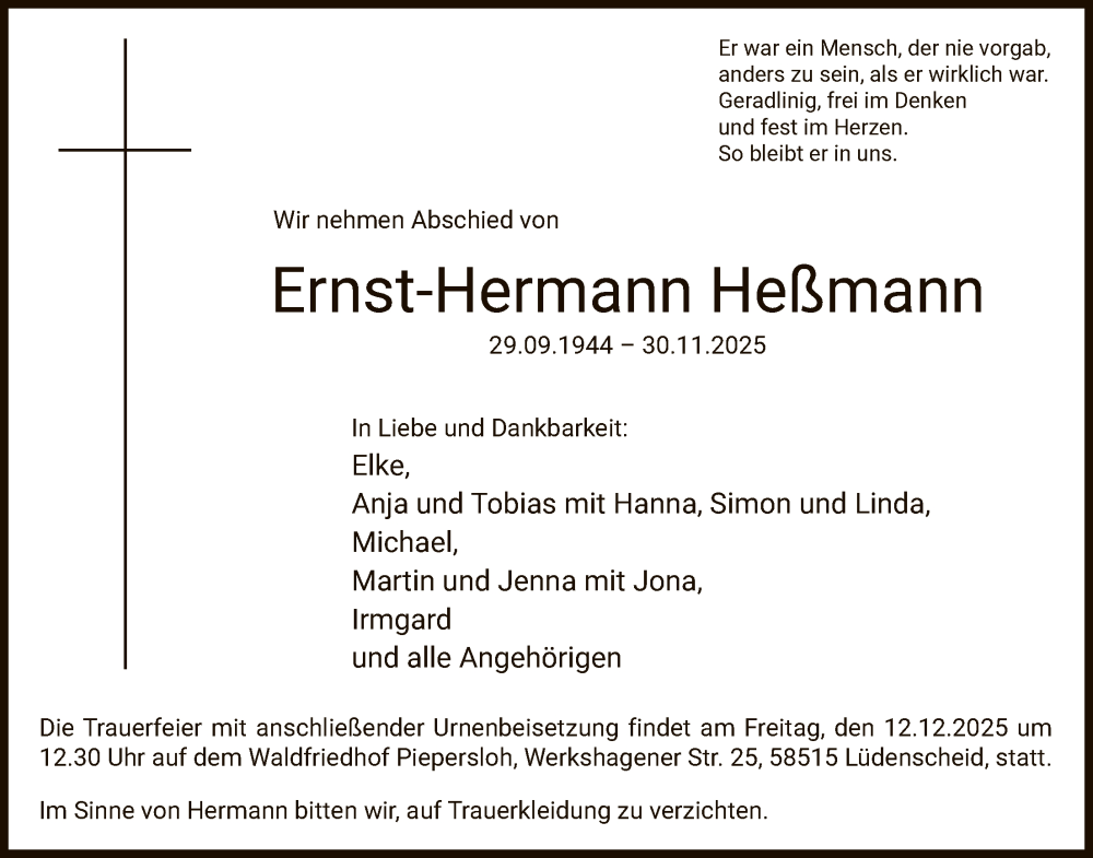 Hier finden Sie alle Traueranzeigen aus der Zeitung, die bisher für Ernst-Hermann Heßmann erschienen sind. Weitere Traueranzeigen, die in der Zeitung erscheinen, werden hier ebenfalls aufgelistet