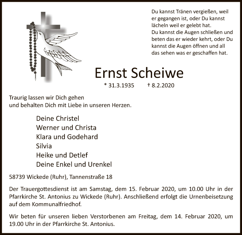 Hier finden Sie alle Traueranzeigen aus der Zeitung, die bisher für Ernst Scheiwe erschienen sind. Weitere Traueranzeigen, die in der Zeitung erscheinen, werden hier ebenfalls aufgelistet
