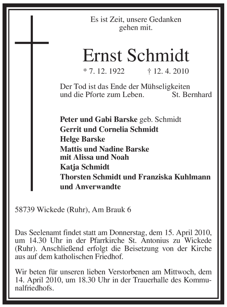 Hier finden Sie alle Traueranzeigen aus der Zeitung, die bisher für Ernst Schmidt erschienen sind. Weitere Traueranzeigen, die in der Zeitung erscheinen, werden hier ebenfalls aufgelistet