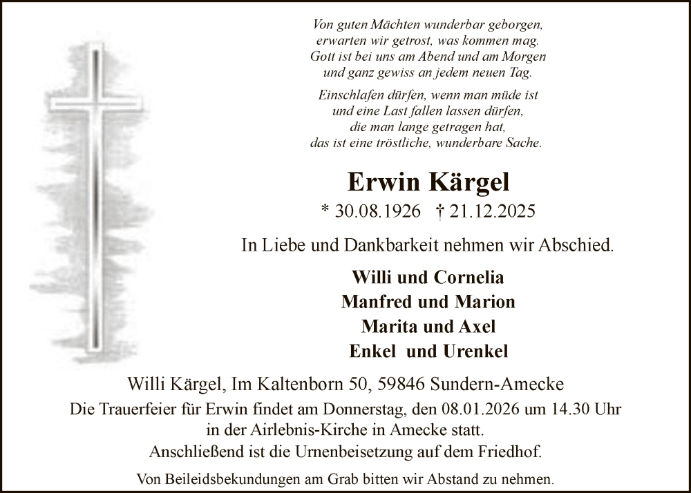 Hier finden Sie alle Traueranzeigen aus der Zeitung, die bisher für Erwin Kärgel erschienen sind. Weitere Traueranzeigen, die in der Zeitung erscheinen, werden hier ebenfalls aufgelistet