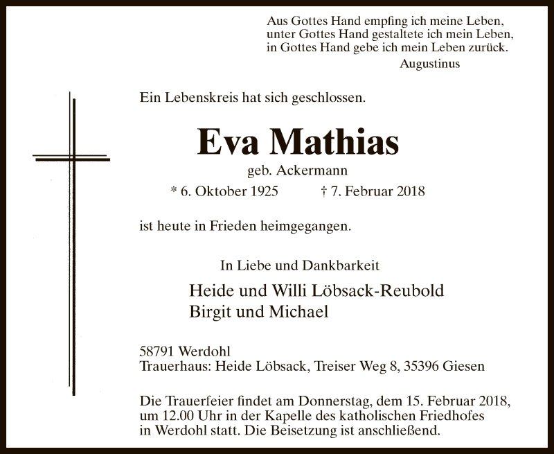 Hier finden Sie alle Traueranzeigen aus der Zeitung, die bisher für Eva Mathias erschienen sind. Weitere Traueranzeigen, die in der Zeitung erscheinen, werden hier ebenfalls aufgelistet
