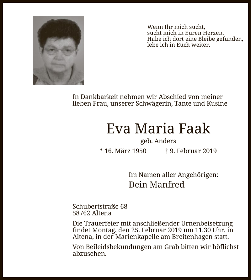 Hier finden Sie alle Traueranzeigen aus der Zeitung, die bisher für Eva Maria Faak erschienen sind. Weitere Traueranzeigen, die in der Zeitung erscheinen, werden hier ebenfalls aufgelistet
