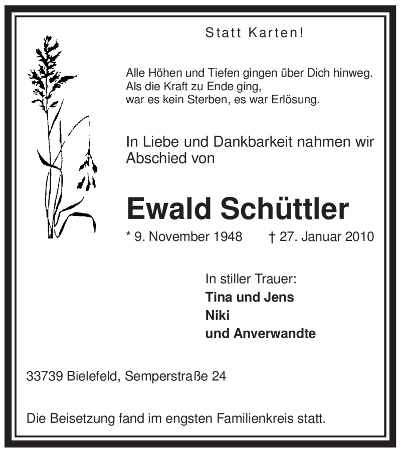Hier finden Sie alle Traueranzeigen aus der Zeitung, die bisher für Ewald Schüttler erschienen sind. Weitere Traueranzeigen, die in der Zeitung erscheinen, werden hier ebenfalls aufgelistet