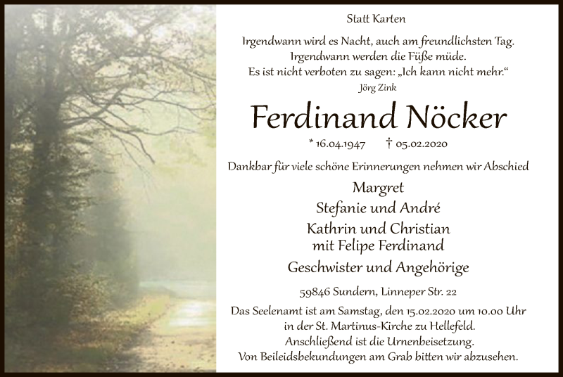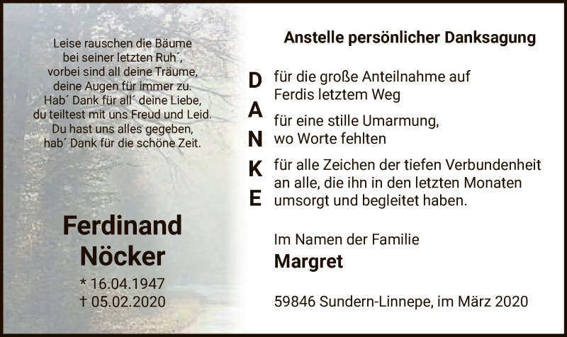 Hier finden Sie alle Traueranzeigen aus der Zeitung, die bisher für Ferdinand Nöcker erschienen sind. Weitere Traueranzeigen, die in der Zeitung erscheinen, werden hier ebenfalls aufgelistet