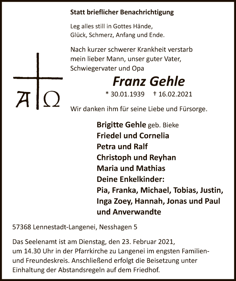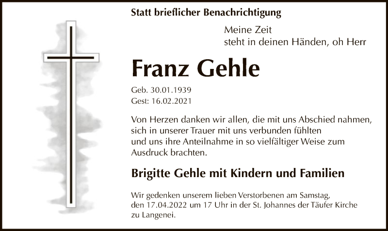 Hier finden Sie alle Traueranzeigen aus der Zeitung, die bisher für Franz Gehle erschienen sind. Weitere Traueranzeigen, die in der Zeitung erscheinen, werden hier ebenfalls aufgelistet