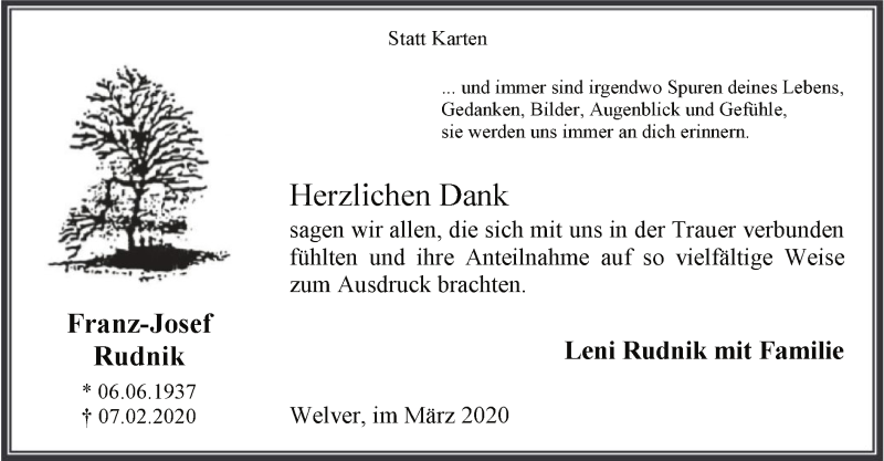 Hier finden Sie alle Traueranzeigen aus der Zeitung, die bisher für Franz-Josef Rudnik erschienen sind. Weitere Traueranzeigen, die in der Zeitung erscheinen, werden hier ebenfalls aufgelistet