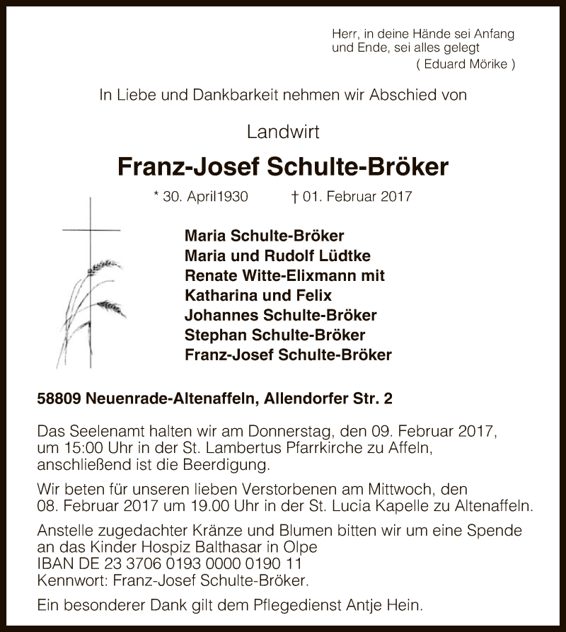 Hier finden Sie alle Traueranzeigen aus der Zeitung, die bisher für Franz-Josef Schulte-Bröker erschienen sind. Weitere Traueranzeigen, die in der Zeitung erscheinen, werden hier ebenfalls aufgelistet