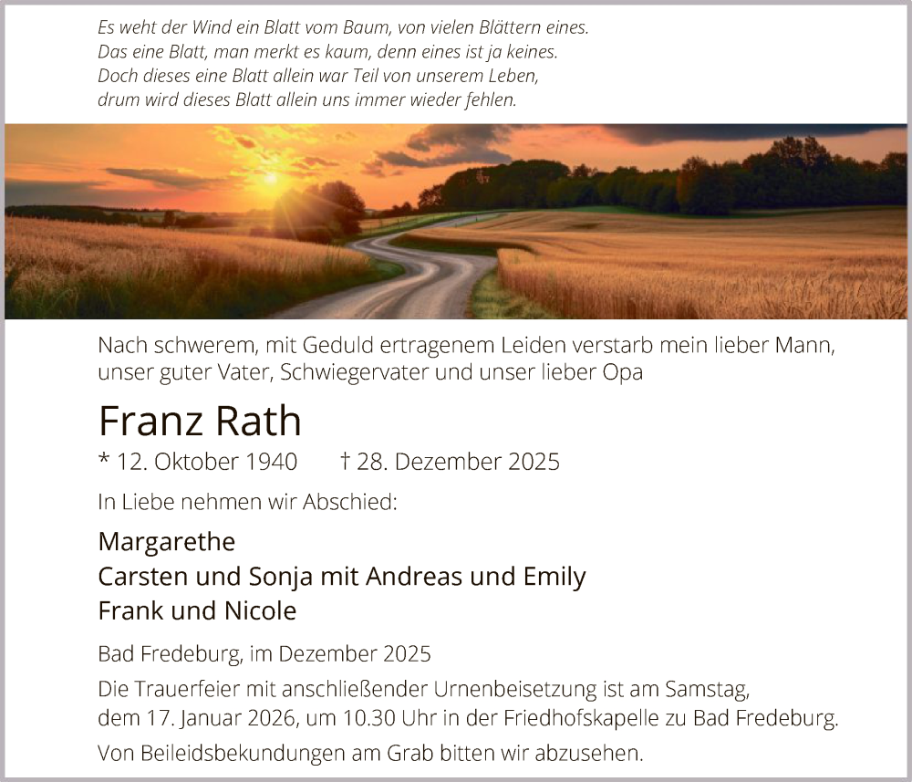 Hier finden Sie alle Traueranzeigen aus der Zeitung, die bisher für Franz Rath erschienen sind. Weitere Traueranzeigen, die in der Zeitung erscheinen, werden hier ebenfalls aufgelistet
