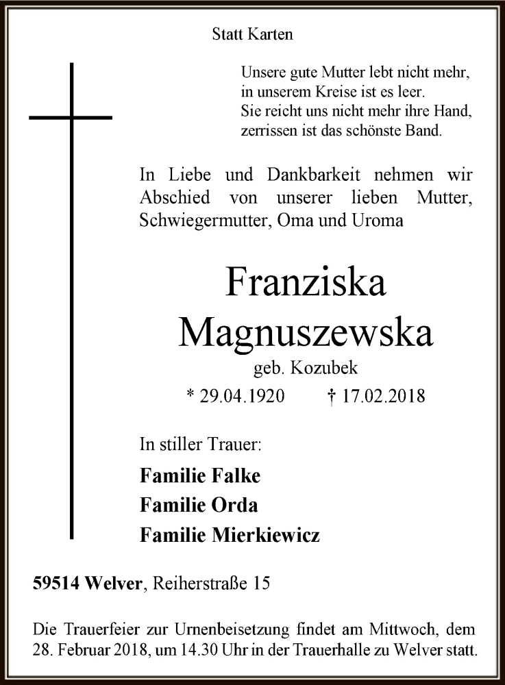 Hier finden Sie alle Traueranzeigen aus der Zeitung, die bisher für Franziska Magnuszewska erschienen sind. Weitere Traueranzeigen, die in der Zeitung erscheinen, werden hier ebenfalls aufgelistet