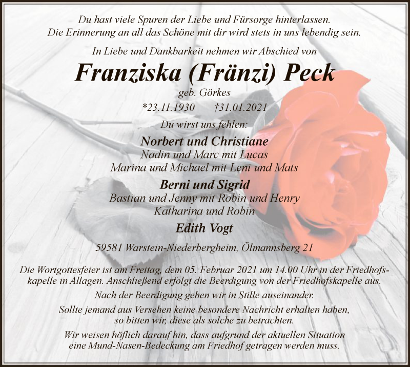 Hier finden Sie alle Traueranzeigen aus der Zeitung, die bisher für Franziska Peck erschienen sind. Weitere Traueranzeigen, die in der Zeitung erscheinen, werden hier ebenfalls aufgelistet