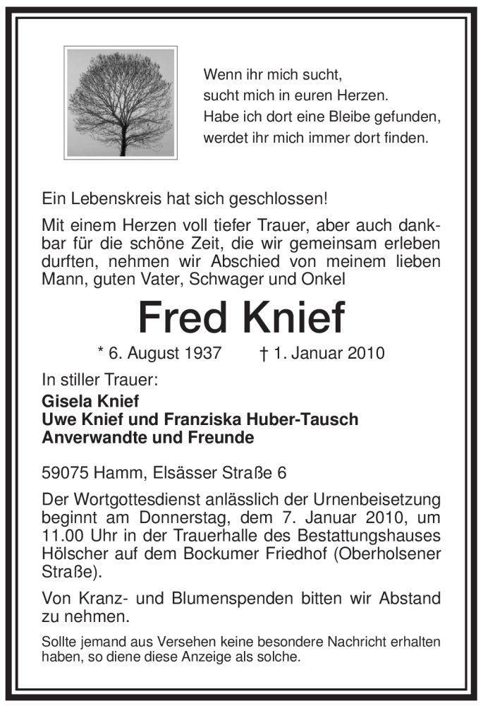 Hier finden Sie alle Traueranzeigen aus der Zeitung, die bisher für Fred Knief erschienen sind. Weitere Traueranzeigen, die in der Zeitung erscheinen, werden hier ebenfalls aufgelistet