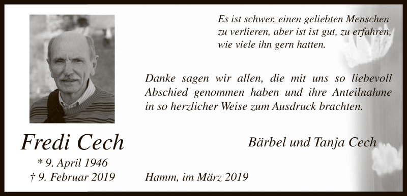 Hier finden Sie alle Traueranzeigen aus der Zeitung, die bisher für Fredi Cech erschienen sind. Weitere Traueranzeigen, die in der Zeitung erscheinen, werden hier ebenfalls aufgelistet