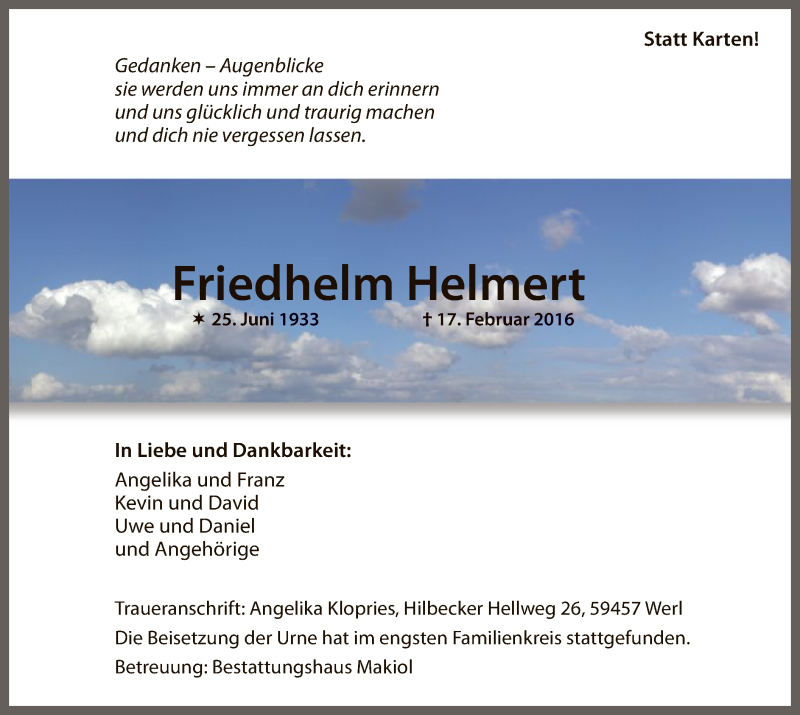 Hier finden Sie alle Traueranzeigen aus der Zeitung, die bisher für Friedhelm Helmert erschienen sind. Weitere Traueranzeigen, die in der Zeitung erscheinen, werden hier ebenfalls aufgelistet