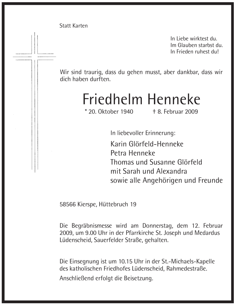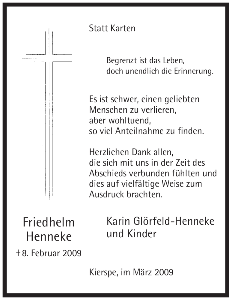 Hier finden Sie alle Traueranzeigen aus der Zeitung, die bisher für Friedhelm Henneke erschienen sind. Weitere Traueranzeigen, die in der Zeitung erscheinen, werden hier ebenfalls aufgelistet