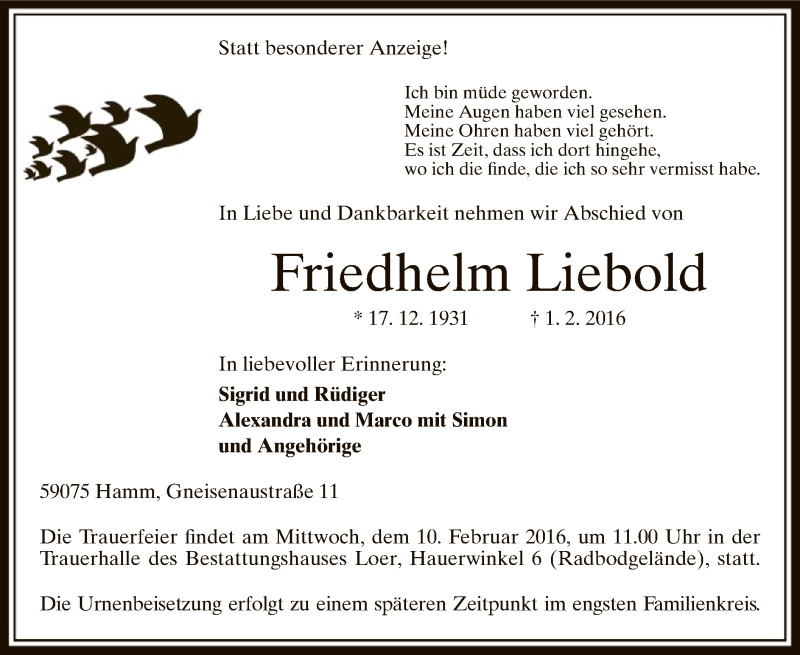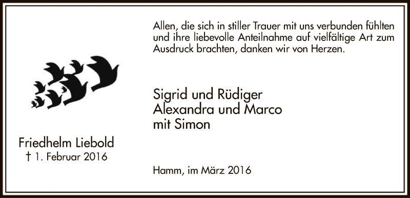 Hier finden Sie alle Traueranzeigen aus der Zeitung, die bisher für Friedhelm Liebold erschienen sind. Weitere Traueranzeigen, die in der Zeitung erscheinen, werden hier ebenfalls aufgelistet