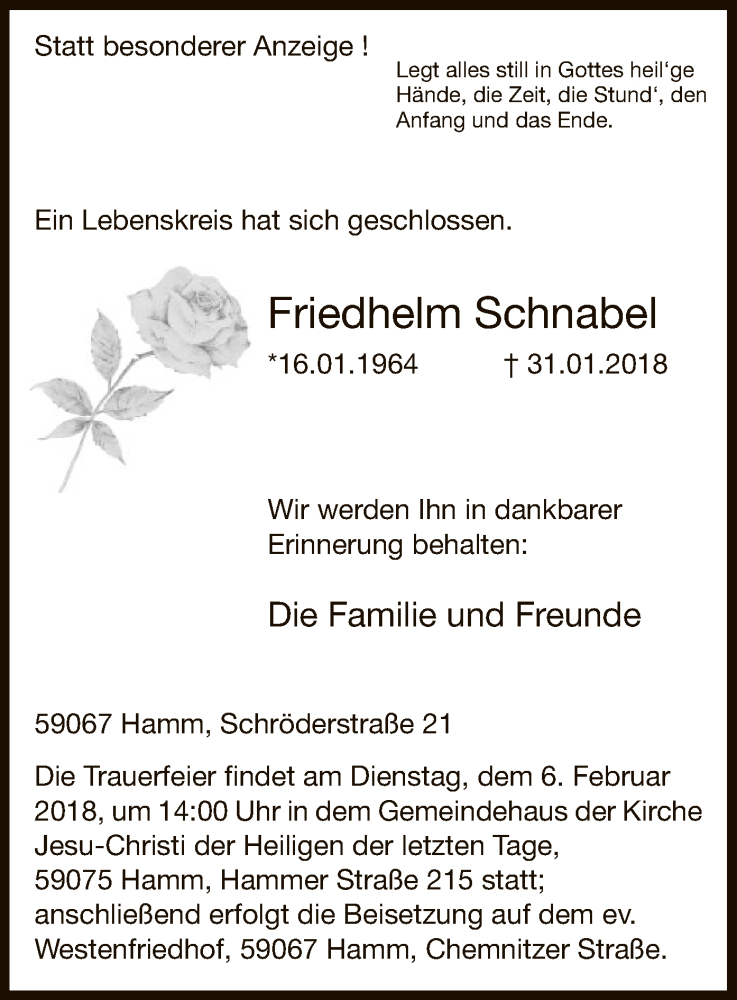 Hier finden Sie alle Traueranzeigen aus der Zeitung, die bisher für Friedhelm Schnabel erschienen sind. Weitere Traueranzeigen, die in der Zeitung erscheinen, werden hier ebenfalls aufgelistet