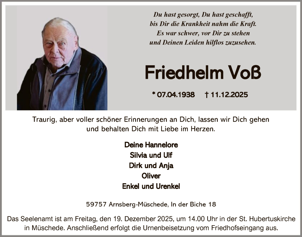 Hier finden Sie alle Traueranzeigen aus der Zeitung, die bisher für Friedhelm Voß erschienen sind. Weitere Traueranzeigen, die in der Zeitung erscheinen, werden hier ebenfalls aufgelistet