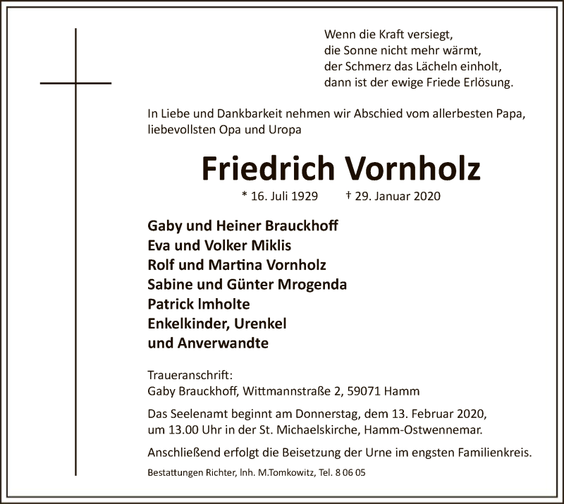 Hier finden Sie alle Traueranzeigen aus der Zeitung, die bisher für Friedrich Vornholz erschienen sind. Weitere Traueranzeigen, die in der Zeitung erscheinen, werden hier ebenfalls aufgelistet