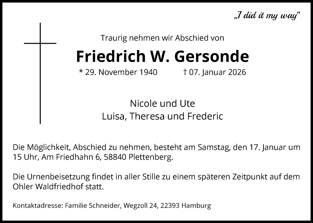 Hier finden Sie alle Traueranzeigen aus der Zeitung, die bisher für Friedrich W. Gersonde erschienen sind. Weitere Traueranzeigen, die in der Zeitung erscheinen, werden hier ebenfalls aufgelistet
