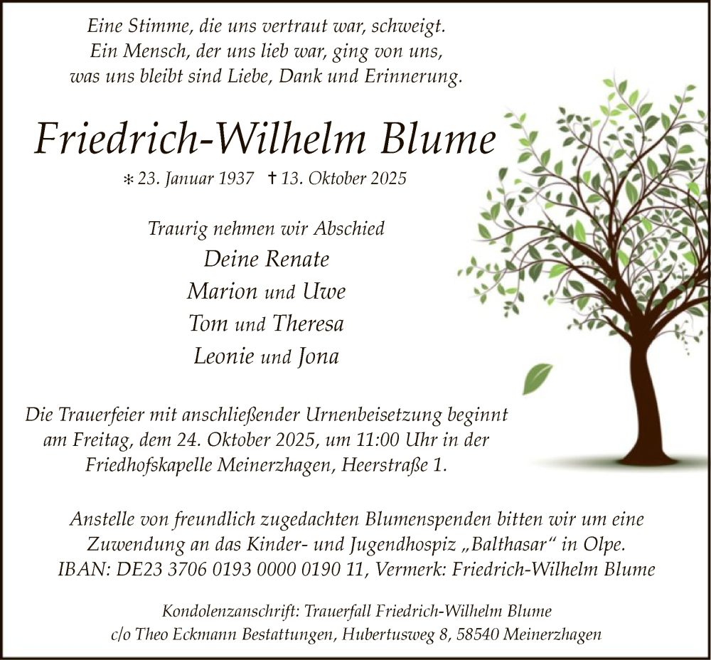 Hier finden Sie alle Traueranzeigen aus der Zeitung, die bisher für Friedrich-Wilhelm Blume erschienen sind. Weitere Traueranzeigen, die in der Zeitung erscheinen, werden hier ebenfalls aufgelistet