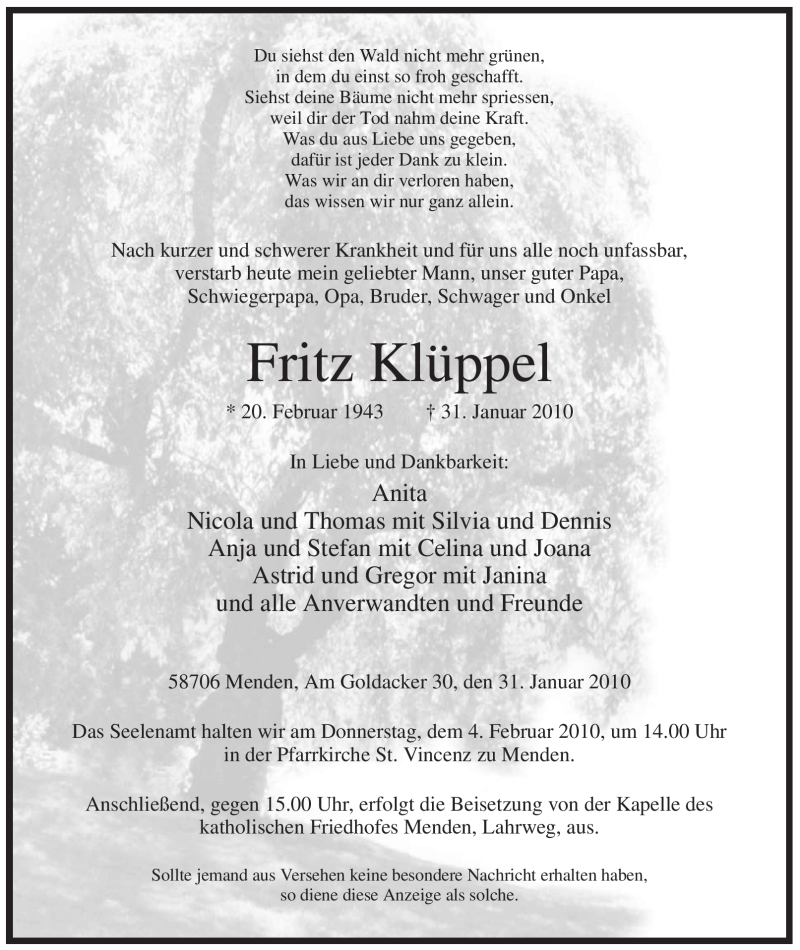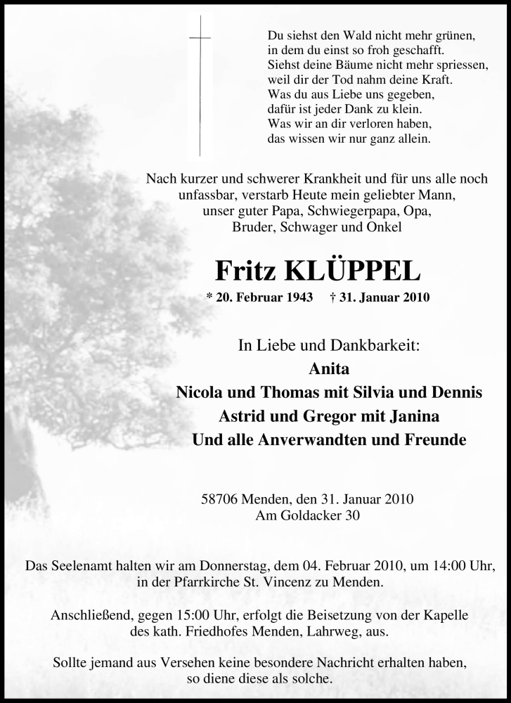 Hier finden Sie alle Traueranzeigen aus der Zeitung, die bisher für Fritz Klüppel erschienen sind. Weitere Traueranzeigen, die in der Zeitung erscheinen, werden hier ebenfalls aufgelistet