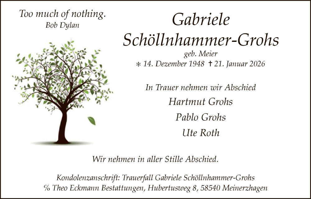 Hier finden Sie alle Traueranzeigen aus der Zeitung, die bisher für Gabriele Schöllnhammer-Grohs erschienen sind. Weitere Traueranzeigen, die in der Zeitung erscheinen, werden hier ebenfalls aufgelistet