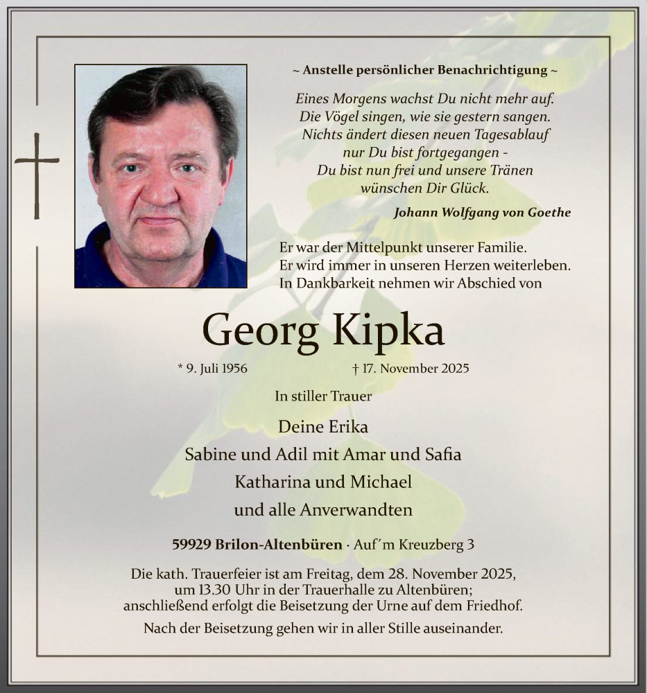 Hier finden Sie alle Traueranzeigen aus der Zeitung, die bisher für Georg Kipka erschienen sind. Weitere Traueranzeigen, die in der Zeitung erscheinen, werden hier ebenfalls aufgelistet