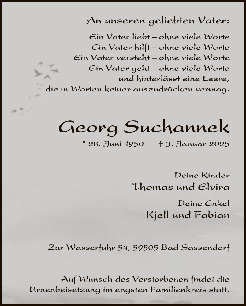 Hier finden Sie alle Traueranzeigen aus der Zeitung, die bisher für Georg Suchannek erschienen sind. Weitere Traueranzeigen, die in der Zeitung erscheinen, werden hier ebenfalls aufgelistet