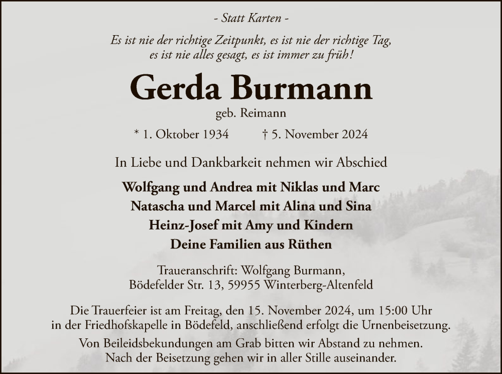 Hier finden Sie alle Traueranzeigen aus der Zeitung, die bisher für Gerda Burmann erschienen sind. Weitere Traueranzeigen, die in der Zeitung erscheinen, werden hier ebenfalls aufgelistet