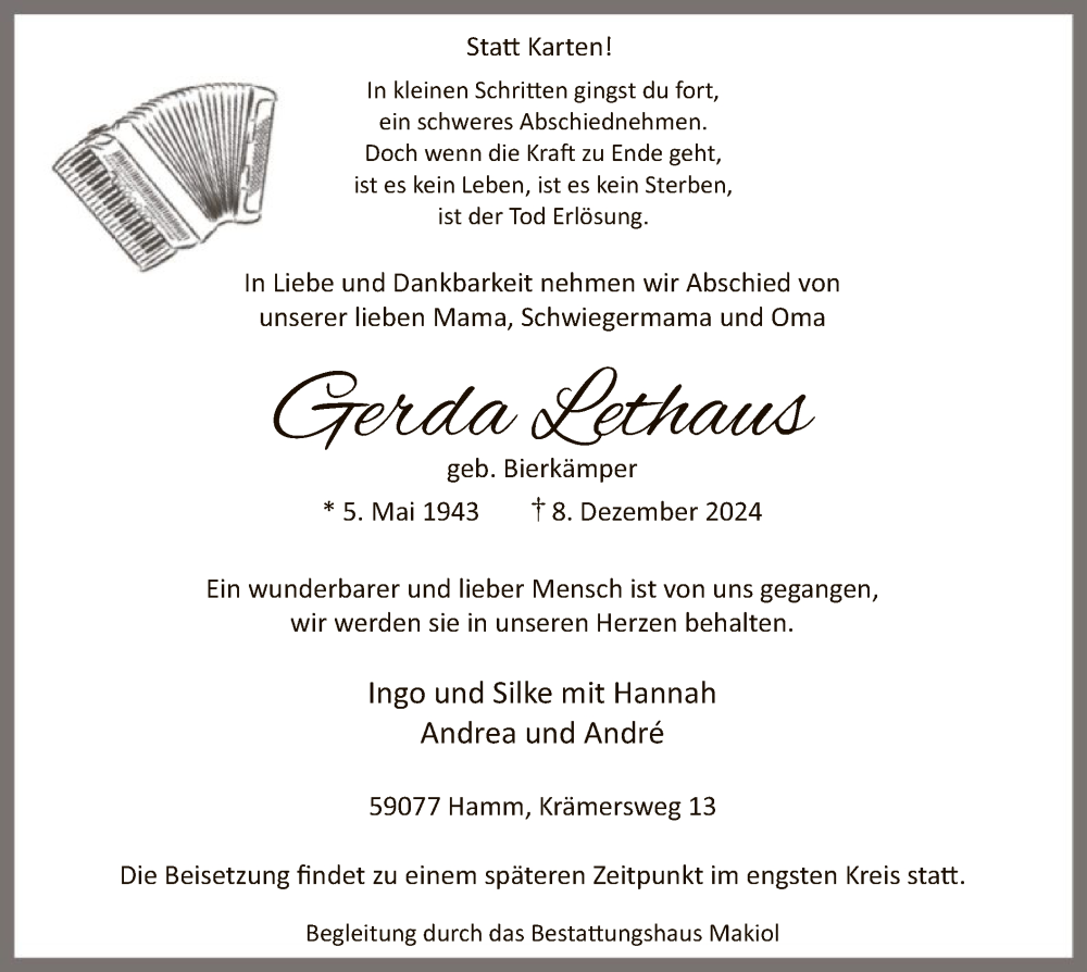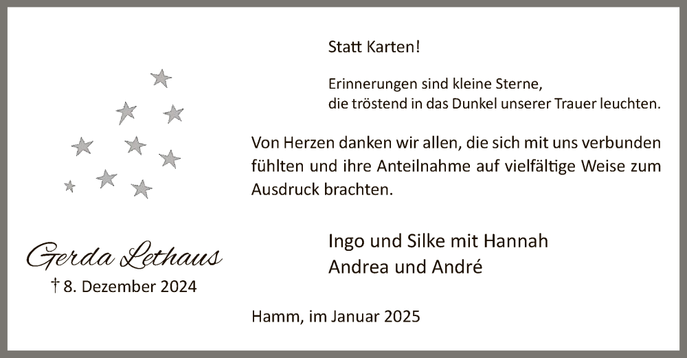 Hier finden Sie alle Traueranzeigen aus der Zeitung, die bisher für Gerda Lethaus erschienen sind. Weitere Traueranzeigen, die in der Zeitung erscheinen, werden hier ebenfalls aufgelistet
