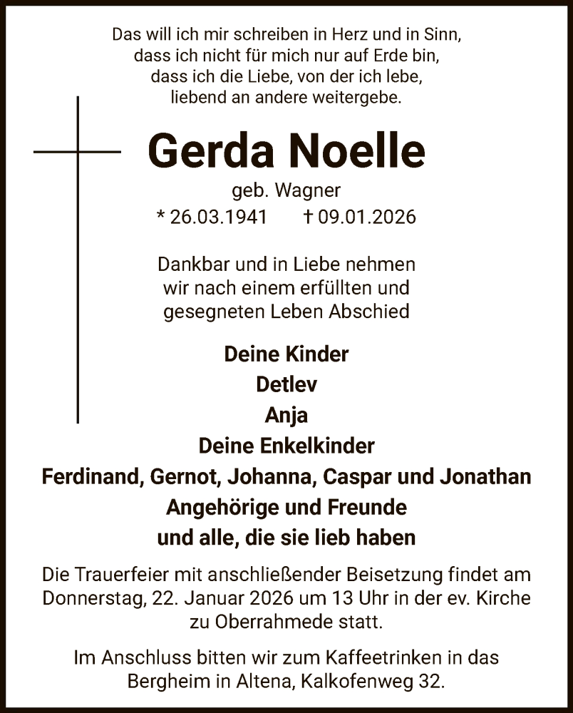Hier finden Sie alle Traueranzeigen aus der Zeitung, die bisher für Gerda Noelle erschienen sind. Weitere Traueranzeigen, die in der Zeitung erscheinen, werden hier ebenfalls aufgelistet