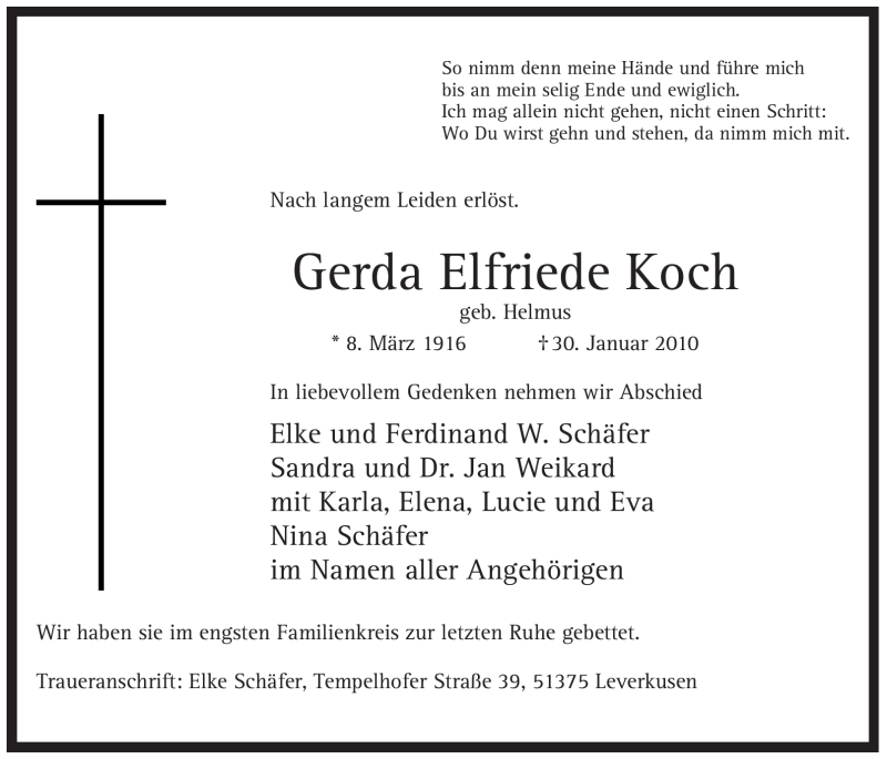 Hier finden Sie alle Traueranzeigen aus der Zeitung, die bisher für Gerda Elfriede Koch erschienen sind. Weitere Traueranzeigen, die in der Zeitung erscheinen, werden hier ebenfalls aufgelistet