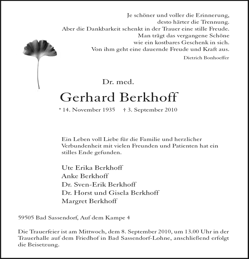 Hier finden Sie alle Traueranzeigen aus der Zeitung, die bisher für Gerhard Berkhoff erschienen sind. Weitere Traueranzeigen, die in der Zeitung erscheinen, werden hier ebenfalls aufgelistet