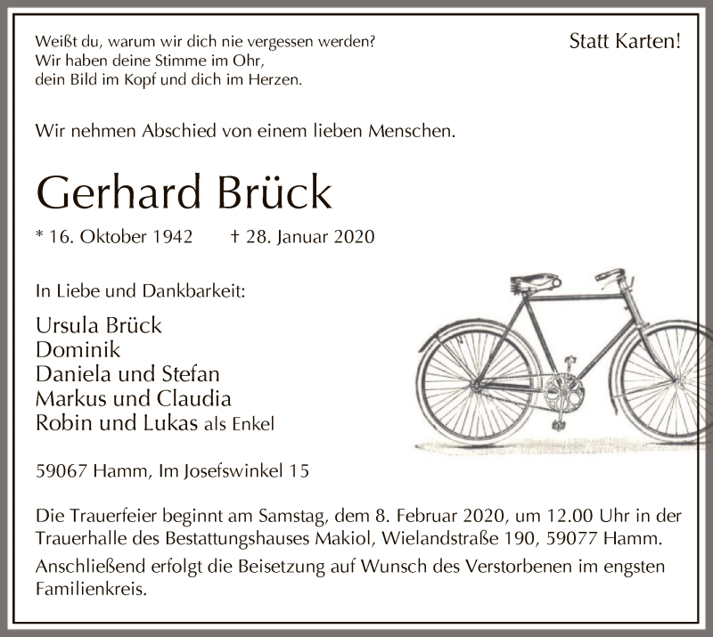 Hier finden Sie alle Traueranzeigen aus der Zeitung, die bisher für Gerhard Brück erschienen sind. Weitere Traueranzeigen, die in der Zeitung erscheinen, werden hier ebenfalls aufgelistet