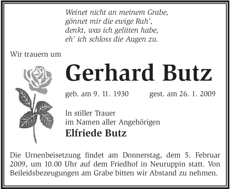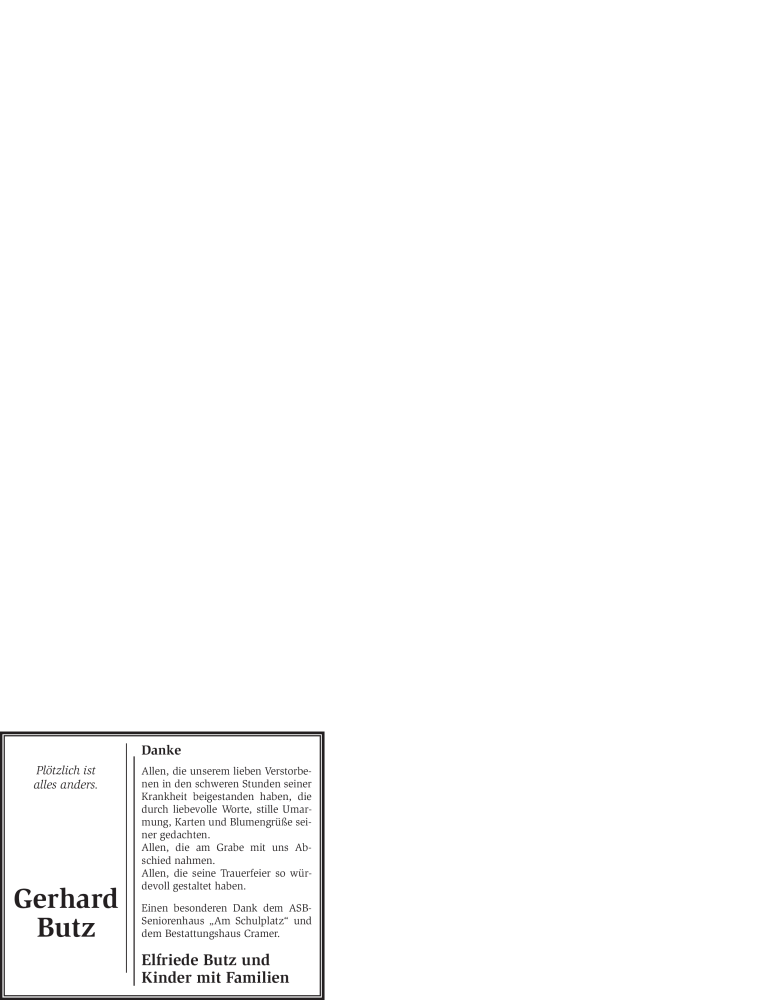 Hier finden Sie alle Traueranzeigen aus der Zeitung, die bisher für Gerhard Butz erschienen sind. Weitere Traueranzeigen, die in der Zeitung erscheinen, werden hier ebenfalls aufgelistet