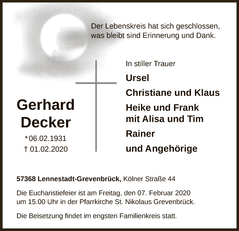 Hier finden Sie alle Traueranzeigen aus der Zeitung, die bisher für Gerhard Decker erschienen sind. Weitere Traueranzeigen, die in der Zeitung erscheinen, werden hier ebenfalls aufgelistet