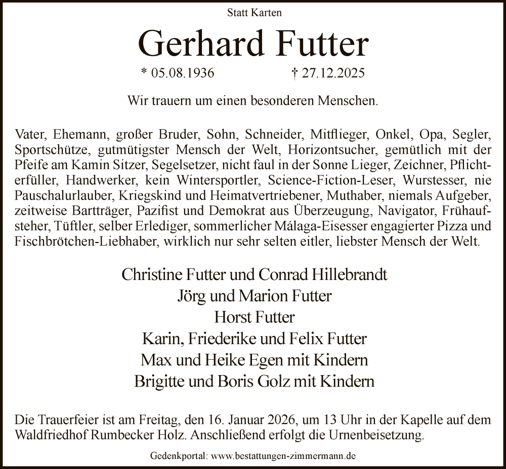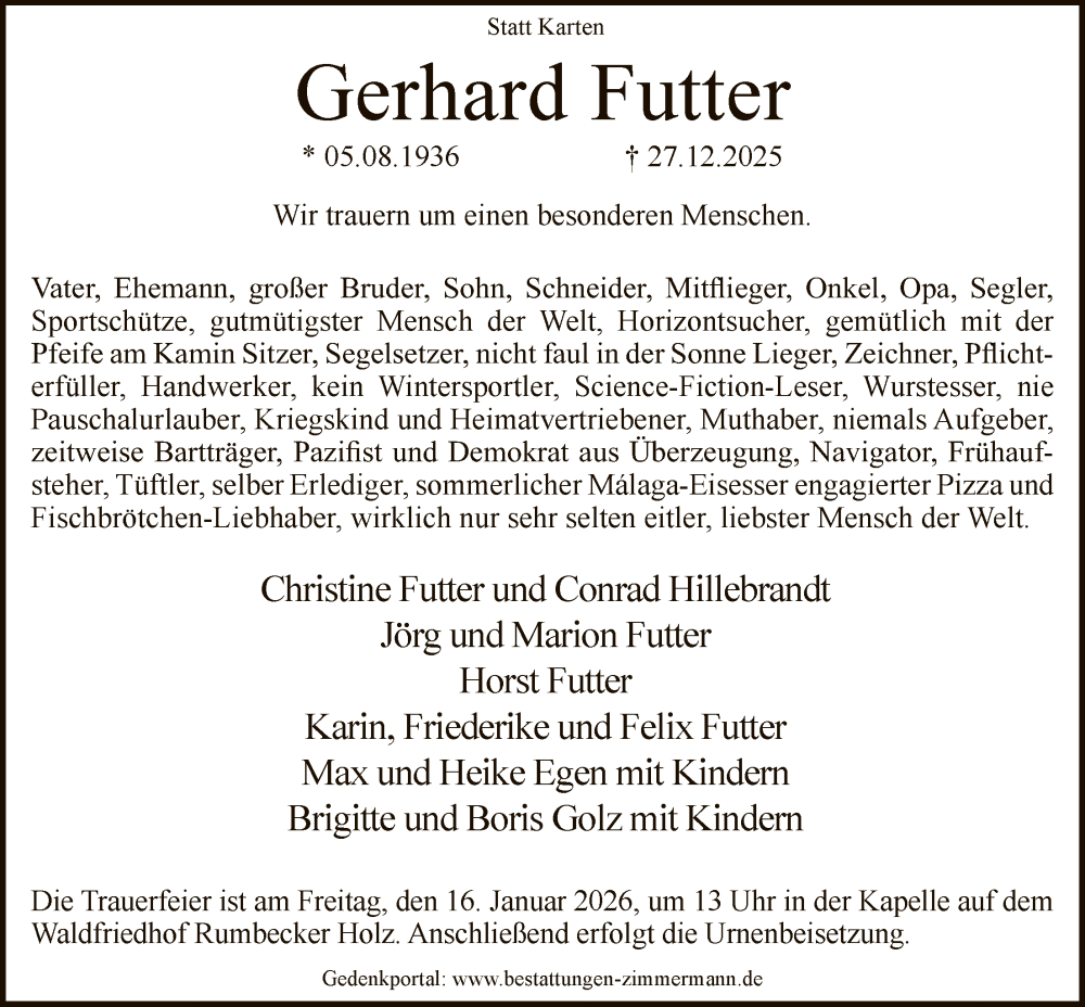 Hier finden Sie alle Traueranzeigen aus der Zeitung, die bisher für Gerhard Futter erschienen sind. Weitere Traueranzeigen, die in der Zeitung erscheinen, werden hier ebenfalls aufgelistet