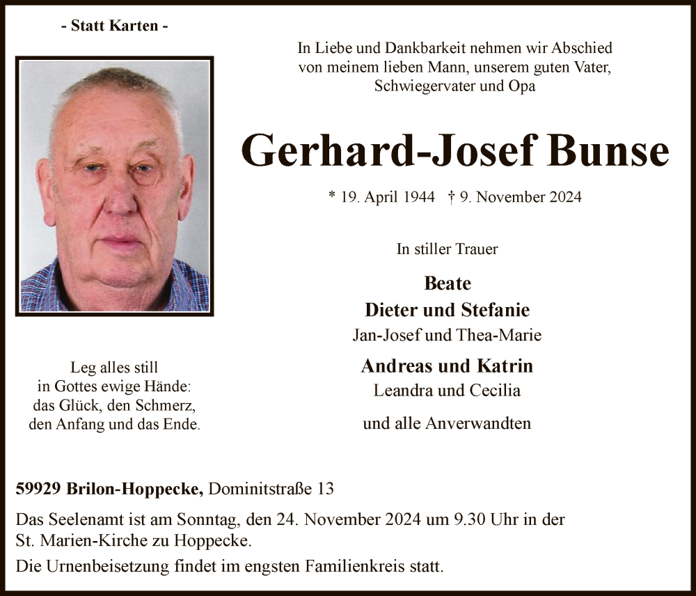 Hier finden Sie alle Traueranzeigen aus der Zeitung, die bisher für Gerhard-Josef Bunse erschienen sind. Weitere Traueranzeigen, die in der Zeitung erscheinen, werden hier ebenfalls aufgelistet
