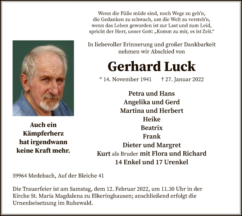 Hier finden Sie alle Traueranzeigen aus der Zeitung, die bisher für Gerhard Luck erschienen sind. Weitere Traueranzeigen, die in der Zeitung erscheinen, werden hier ebenfalls aufgelistet