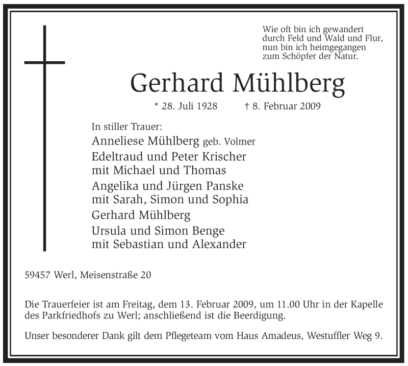 Hier finden Sie alle Traueranzeigen aus der Zeitung, die bisher für Gerhard Mühlberg erschienen sind. Weitere Traueranzeigen, die in der Zeitung erscheinen, werden hier ebenfalls aufgelistet