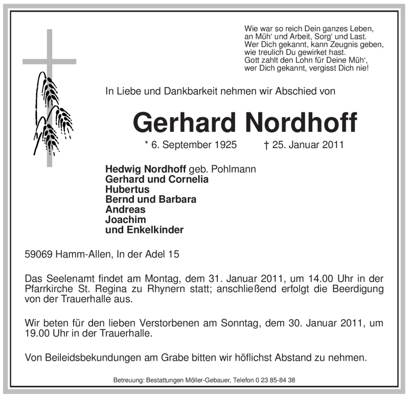 Hier finden Sie alle Traueranzeigen aus der Zeitung, die bisher für Gerhard Nordhoff erschienen sind. Weitere Traueranzeigen, die in der Zeitung erscheinen, werden hier ebenfalls aufgelistet