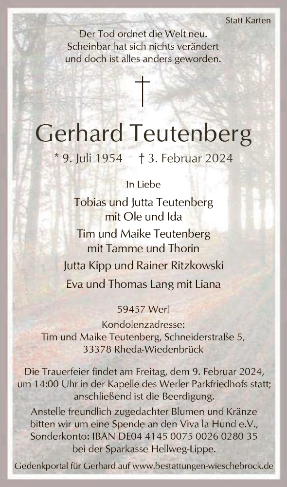 Hier finden Sie alle Traueranzeigen aus der Zeitung, die bisher für Gerhard Teutenberg erschienen sind. Weitere Traueranzeigen, die in der Zeitung erscheinen, werden hier ebenfalls aufgelistet