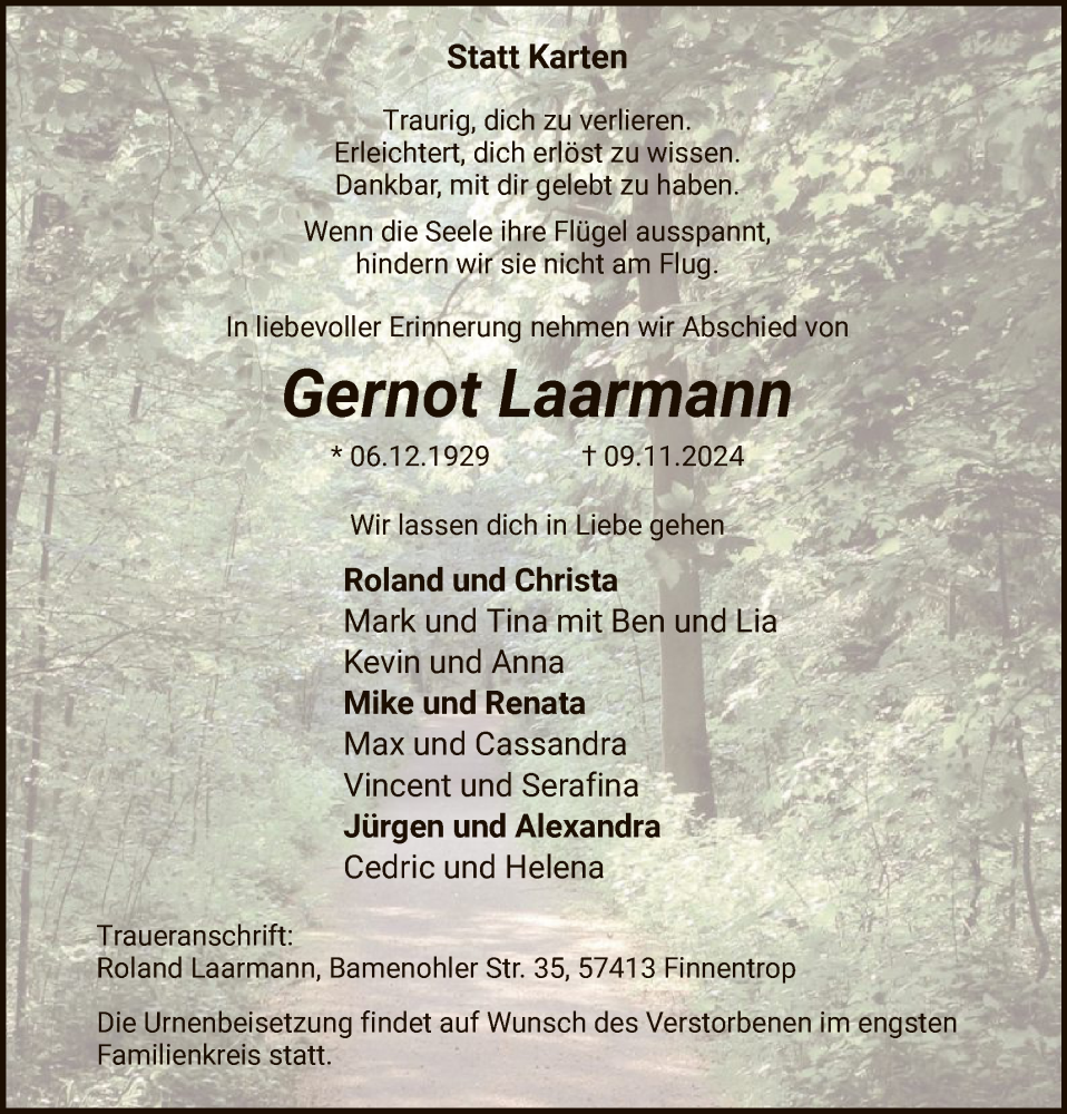 Hier finden Sie alle Traueranzeigen aus der Zeitung, die bisher für Gernot Laarmann erschienen sind. Weitere Traueranzeigen, die in der Zeitung erscheinen, werden hier ebenfalls aufgelistet