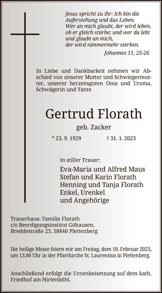 Hier finden Sie alle Traueranzeigen aus der Zeitung, die bisher für Gertrud Florath erschienen sind. Weitere Traueranzeigen, die in der Zeitung erscheinen, werden hier ebenfalls aufgelistet