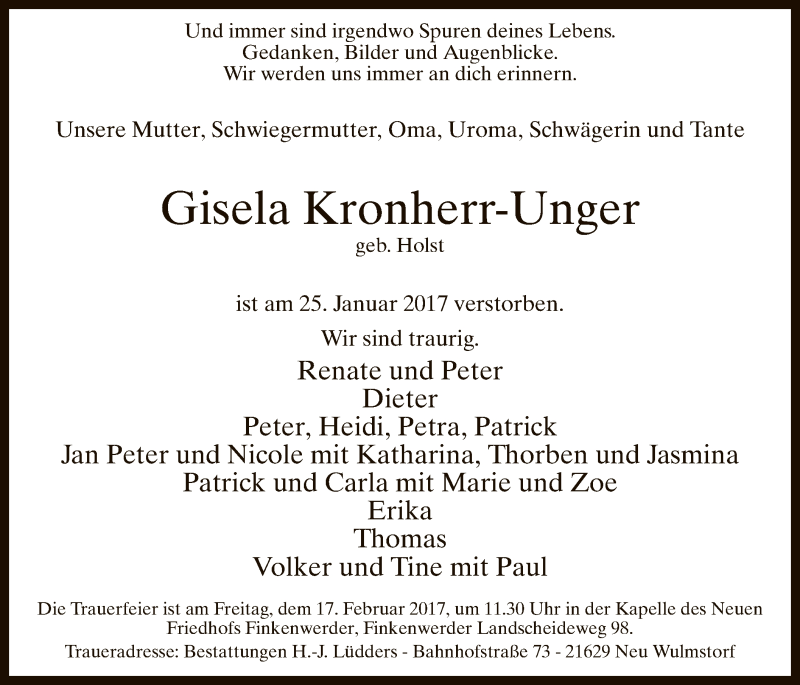Hier finden Sie alle Traueranzeigen aus der Zeitung, die bisher für Gisela Kronherr-Unger erschienen sind. Weitere Traueranzeigen, die in der Zeitung erscheinen, werden hier ebenfalls aufgelistet