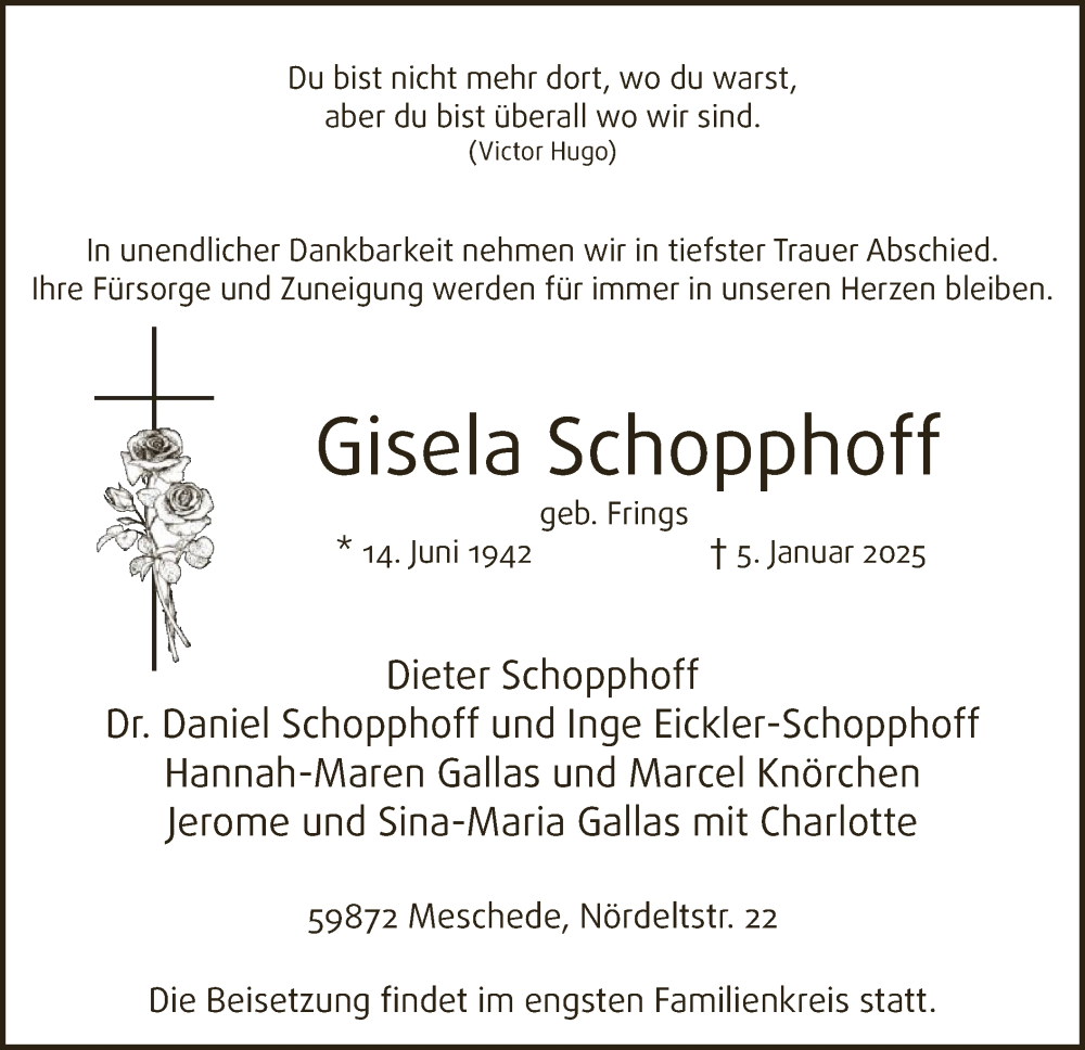 Hier finden Sie alle Traueranzeigen aus der Zeitung, die bisher für Gisela Schopphoff erschienen sind. Weitere Traueranzeigen, die in der Zeitung erscheinen, werden hier ebenfalls aufgelistet