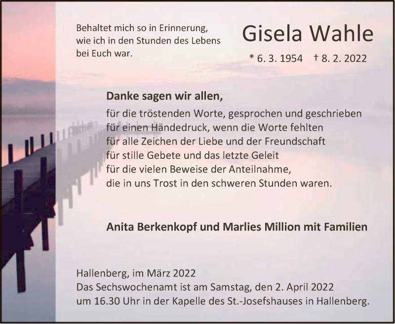Hier finden Sie alle Traueranzeigen aus der Zeitung, die bisher für Gisela Wahle erschienen sind. Weitere Traueranzeigen, die in der Zeitung erscheinen, werden hier ebenfalls aufgelistet