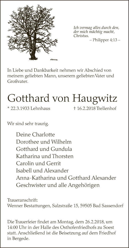 Hier finden Sie alle Traueranzeigen aus der Zeitung, die bisher für Gotthard von Haugwitz erschienen sind. Weitere Traueranzeigen, die in der Zeitung erscheinen, werden hier ebenfalls aufgelistet