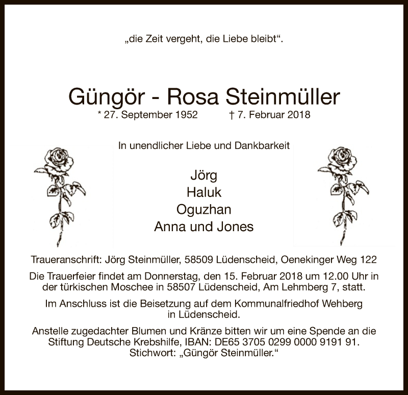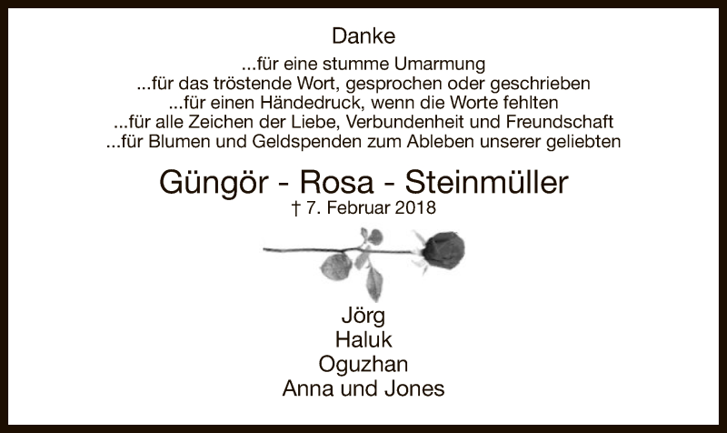 Hier finden Sie alle Traueranzeigen aus der Zeitung, die bisher für Güngör-Rosa Steinmüller erschienen sind. Weitere Traueranzeigen, die in der Zeitung erscheinen, werden hier ebenfalls aufgelistet